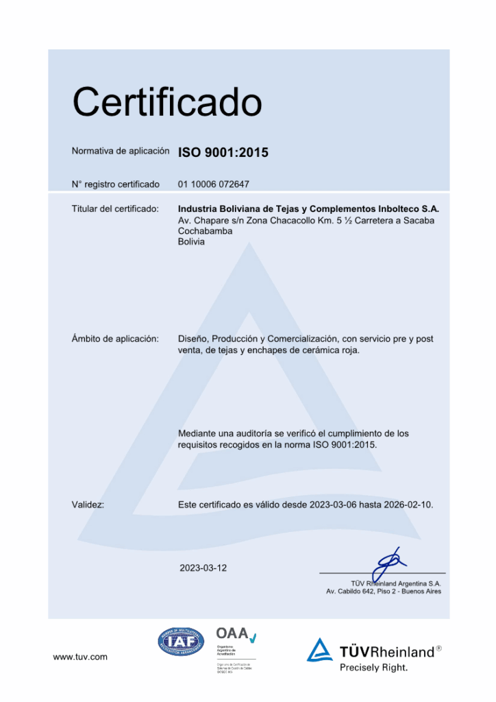 Ante el compromiso permanente con nuestros clientes es que INBOLTECO obtiene la certificación del Sistema de Gestión de Calidad en el año 2008, por la TUV RHEINLAND.